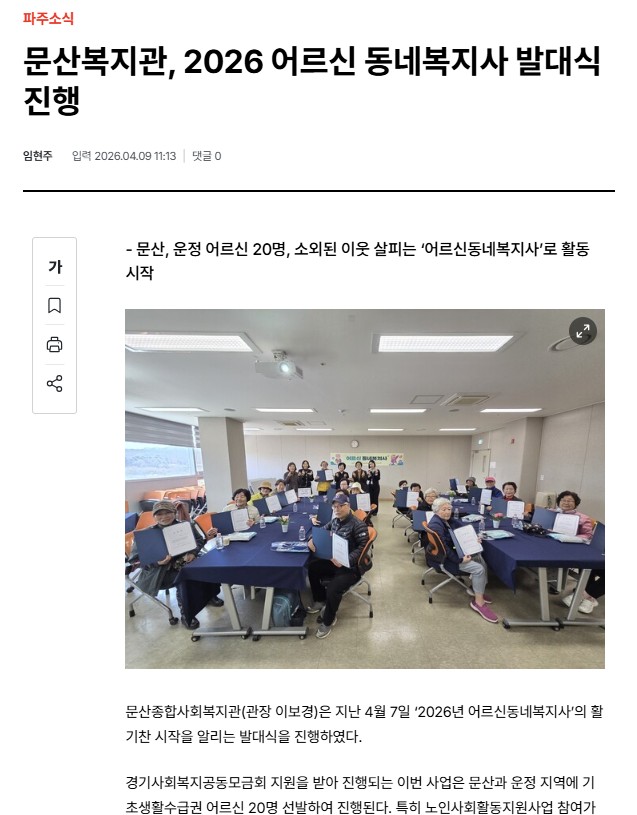 문산복지관, 2026 어르신 동네복지사 발대식 진행